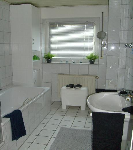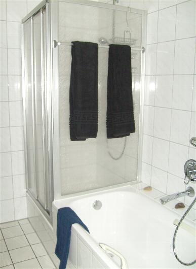 Das Badetimmer ist sehr hell und zweckmäßig. Es sind sowohl eine Dusche wie auch eine große Badewanne vorhanden. Großer Spiegel, genügend Ablageflächen und ein Schrank machen Ihnen den Aufenthalt angenehm unkompliziert.