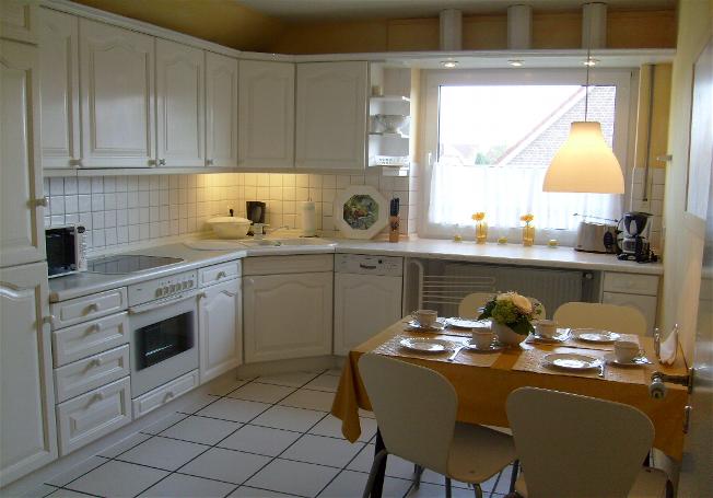 In der Einbauküche finden Sie alles was Sie zum Kochen und genußvollen Essen benötigen. Die Asstattung besteht aus einer Kühl-Gefrierkombination, einem Einbauherd mit Ober-Unterhitze und Umluftfunktion, Mikrowellengrill, Spülmaschiene sowie Kaffemaschiene, Toaster, Mixer und Wasserkocher.